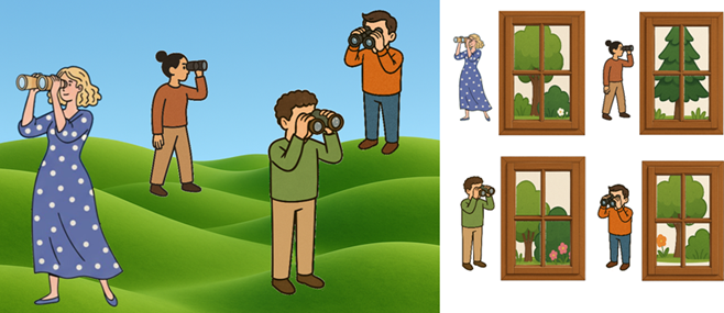 Imagine people scattered through some area, looking through binoculars. None of them will see the whole scenery, they will only see part of it. It is like each of them is looking through the different window.