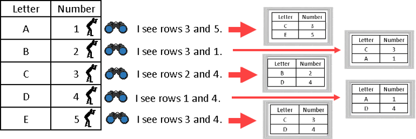 Now, imagine that in each row, of a database table, there is a data scientist looking through binoculars. Each data scientist can only see some of the rows from that table. Each data scientist has his own window.