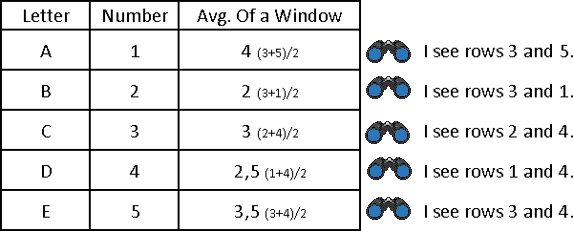 In the real database table, with millions of rows, these average values would not be representatives of anything. Our windows are too random. If we can create a rule by which windows are created, then we would have a scientific view of our data. Let's say that each data scientist can only see his own row, and previous two rows. Then we would have a rule. Check out animated image below (left image).