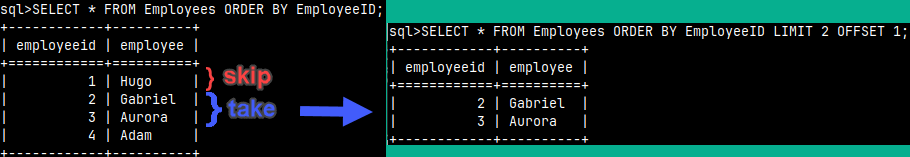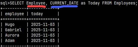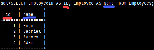 | 1) CREATE TABLE Employees ( EmployeeID INT, Employee VARCHAR(10 ) ); 2) INSERT INTO Employees ( EmployeeID, Employee ) VALUES ( 1, 'Hugo' ), ( 2, 'Gabriel' ), ( 3, 'Aurora' ), ( 4, 'Adam' ); |