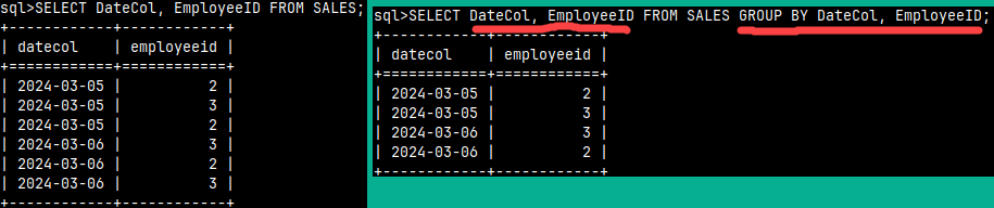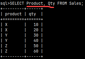 | 1) CREATE TABLE Sales ( SalesID INT, DateCol DATE, EmployeeID INT, Product CHAR(1), Qty INTEGER, Price INTEGER ); 2) INSERT INTO Sales ( SalesID, DateCol, EmployeeID, Product, Qty, Price ) VALUES ( 1, '2024-03-05', 2, 'X', 10, 4) , ( 2, '2024-03-05', 3, 'X', 20, 5) , ( 3, '2024-03-05', 2, 'Y', 30, 6) , ( 4, '2024-03-06', 3, 'Y', 40, 7) , ( 5, '2024-03-06', 2, 'Z', 50, 8) , ( 6, '2024-03-06', 3, 'Z', 60, 9) |