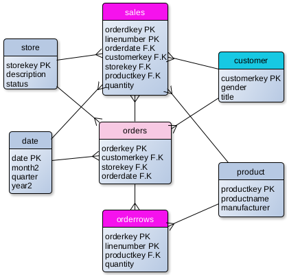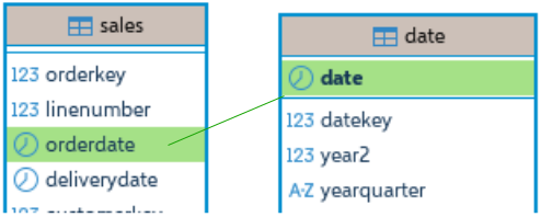ALTER TABLE date ADD CONSTRAINT date_pk PRIMARY KEY ( date ); ALTER TABLE sales ADD CONSTRAINT FKfromDate FOREIGN KEY ( orderdate ) REFERENCES date ( date );