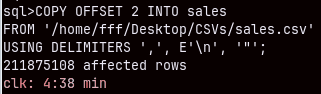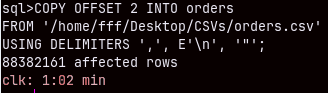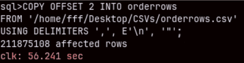 COPY OFFSET 2 INTO orderrows FROM '/home/fff/Desktop/CSVs/orderrows.csv' USING DELIMITERS ',', E'\n', '"';