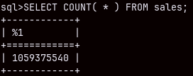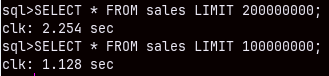 SELECT * FROM sales LIMIT 1000000;--13 ms SELECT * FROM sales LIMIT 2000000; --24 ms