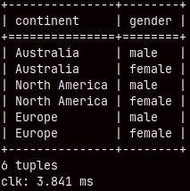 From the table "customer" we can list distinct continents and genders in 3.841 ms.