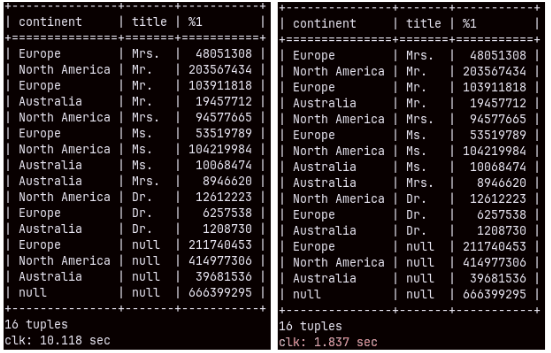 This time we have unusually slow query. It will take full 10 seconds. SELECT continent, title, SUM( quantity ) FROM customer INNER JOIN sales ON customer.customerkey = sales.customerkey GROUP BY ROLLUP( continent, title ); ——————————————————————————————————————————– Query with union would be much better choice for this. Only 1.837 seconds. SELECT continent, title, SUM( quantity ) FROM sales INNER JOIN customer ON sales.customerkey = customer.customerkey GROUP BY continent, title UNION SELECT continent, null, SUM( quantity ) FROM sales INNER JOIN customer ON sales.customerkey = customer.customerkey GROUP BY continent UNION SELECT null, null, SUM( quantity ) FROM sales;