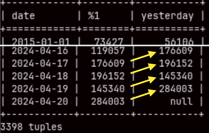 SELECT date, SUM( Quantity ), LAG( SUM( Quantity ), -1 ) OVER ( ORDER BY date ) AS Yesterday FROM date INNER JOIN sales ON date.date = sales.orderdate GROUP BY date;