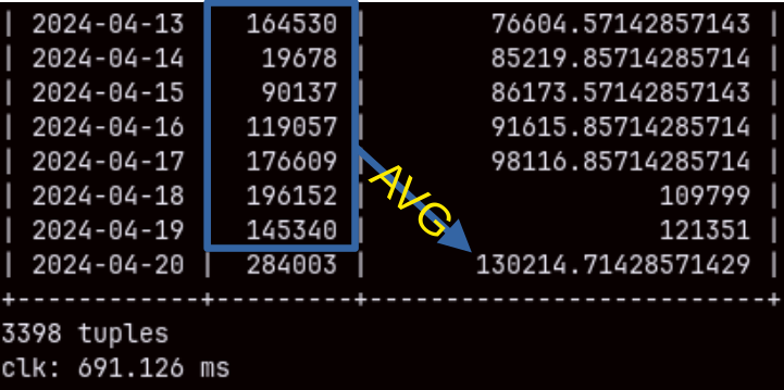 We can calculate sales for the current date, and the average for the previous seven days. This query is executed in 700 ms. SELECT date, SUM( Quantity ), AVG( SUM( Quantity ) ) OVER ( ORDER BY date ROWS BETWEEN 7 PRECEDING AND 1 PRECEDING ) AS SevenDaysAVG FROM date INNER JOIN sales ON date.date = sales.orderdate GROUP BY date ORDER BY date;