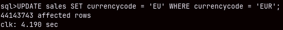 MonetDB should be slow for updates, but it managed to update 44 milion rows for just 4.19 seconds. UPDATE sales SET currencycode = 'EU' WHERE currencycode = 'EUR';