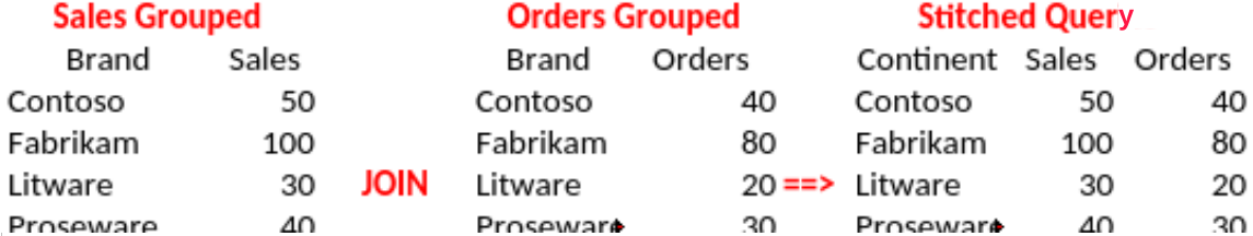 "Stitch" query is when we aggregate two fact tables per the same dimension and we get two data sets as a result. Then we join those two data sets in the final result. This is how we aggregate values from two fact tables.