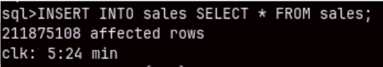 I will now run this statement to make my sales table twice bigger. INSERT INTO sales SELECT * FROM sales; MonetDB needed 5 minutes to do this.