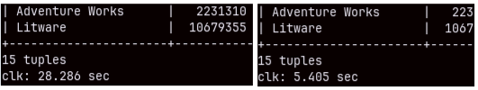 MonetDB is reporting that the second query is slower than the first one. That is something that we are expecting. The problem is that according to my computer clock the first query was finished after 7 seconds, and the second one after 15 seconds.