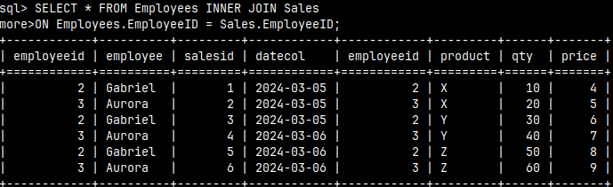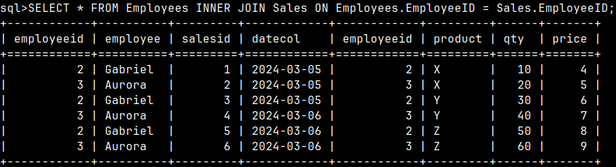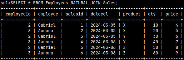 INNER JOINSELECT * FROM Employees INNER JOIN Sales | An easier way to achieve this is to use NATURAL JOIN. A NATURAL JOIN will give us the same result based on the fact that the EmployeeID column exists in both tables and is of the same data type. There are no other columns with such quality. Notice that now we only have one "employeeid" column in the result.SELECT * FROM Employees NATURAL JOIN Sales; |