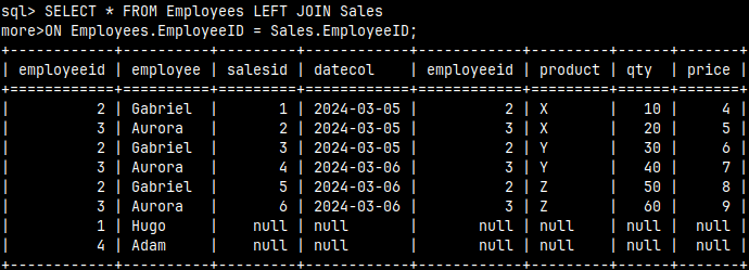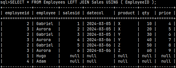 | LEFT JOIN SELECT * FROM Employees LEFT JOIN Sales | An easier way to achieve this is to use the USING clause. In the USING clause, we only need to specify some of the columns that exist in both tables and have the same name and data type. The JOIN condition will be based on the equality of those columns. Again, the column "employeeid" will appear only once.SELECT * FROM Employees LEFT JOIN Sales |