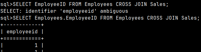 ![]() | Statement with a specific column "EmployeeID" will become ambiguous.SELECT EmployeeID FROM Employees CROSS JOIN Sales;We'll have to write the full column name to avoid that ambiguity. SELECT Employees.EmployeeID FROM Employees CROSS JOIN Sales; |