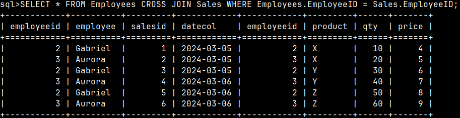 SELECT * FROM Employees CROSS JOIN SalesThis is the definition of an INNER JOIN. An INNER JOIN is a CROSS JOIN where only columns that meet certain conditions are saved in the result. | ![]() |