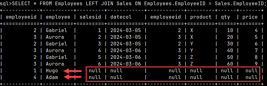 ![]() | SELECT * FROM Employees LEFT JOIN SalesLEFT OUTER JOIN is when we want to expose employees without sales. LEFT OUTER JOIN will show us all rows from the Employees table. If any rows from the Employees table do not have matching rows in the Sales table, then they will be accompanied by null values. Nulls will help us easily see which rows from the Employees table do not have corresponding rows in the Sales table. |