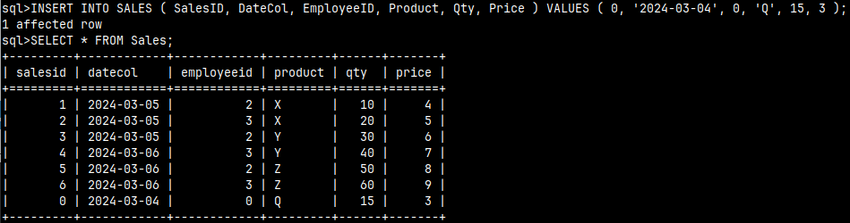 I will add another Sale to the Sales table. We'll pretend that the former employee made that sale.INSERT INTO SALES ( SalesID, DateCol, EmployeeID, Product, Qty, Price ) VALUES ( 0, '2024-03-04', 0, 'Q', 15, 3 );