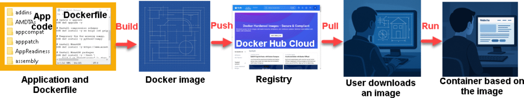 Let's say we want to publish our application as an image. We will package all our source code along with a "Dockerfile" (explained later) into a single folder. We would use the "Build" command to create a "Docker image". The image is the template from which containers are built. We will upload that image to a Docker image repository (registry). "Docker hub" is a well-known cloud image registry. Users can download our image from the registry. Based on that image, the user will launch the container. In the container, the user would find the application we created.