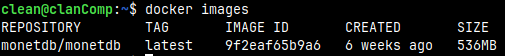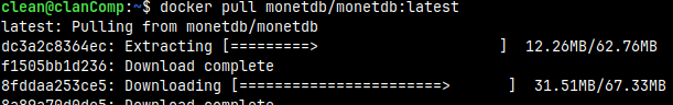 We can download the latest version to our computer using this command. docker pull monetdb/monetdb:latest
