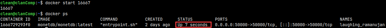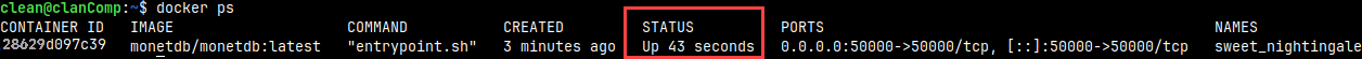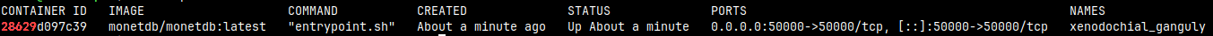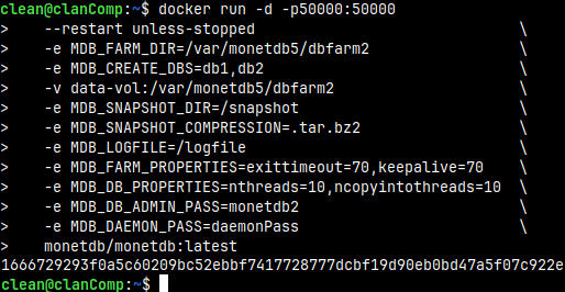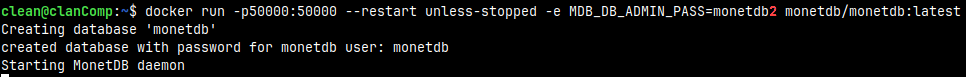 docker run -p50000:50000--restart unless-stopped -e MDB_DB_ADMIN_PASS=monetdb2 monetdb/monetdb:latest