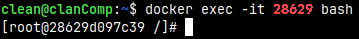 We can connect to bash in the new container. "28629" are start figures of the container ID. We will be connected as a root. docker exec -it 28629 bash