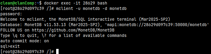 mclient -u monetdb -d monetdb # monetdb2 is password