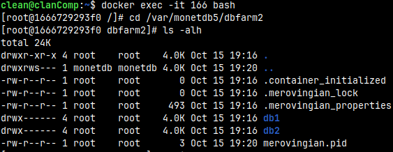 Inside of the bash I will jump do "dbfarm2" folder. cd /var/monetdb5/dbfarm2