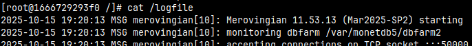 We set MDB_LOGFILE to be "/logfile". That is where is MonetDB log: cat /logfile
