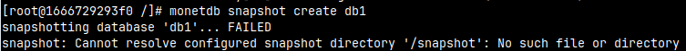 MonetDB will try but will fail because "/snapshot" directory doesn't exist. We must create it.