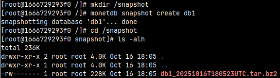 mkdir /snapshot monetdb snapshot create db1 cd /snapshot ls -alh