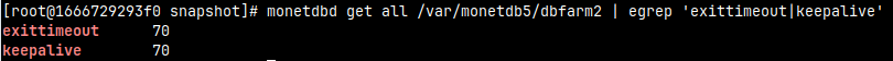 With MDB_FARM_PROPERTIES environs we set two DBfarm properties. monetdbd get all /var/monetdb5/dbfarm2 | egrep 'exittimeout|keepalive'