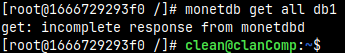 If I try to read database properties with "monetdb get all db1", I am getting an error "incomplete response from monetdb". I don't know why this is happening. We are also kicked out from the bash. This is a bug.