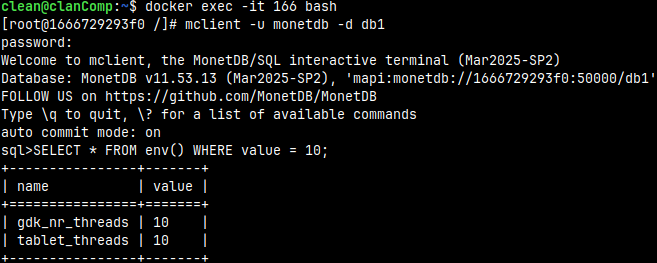 docker exec -it 166 bash mclient -u monetdb -d db1 #password monetdb2 SELECT * FROM env() WHERE value = 10;