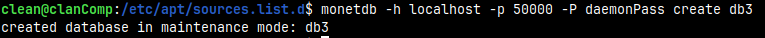 I will run this command from the host OS to control monetdbd daemon inside of the container. monetdb -h localhost -P daemonPass create db3