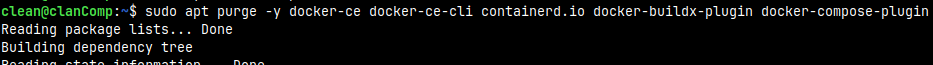 We can now uninstall all parts of the docker: sudo apt purge -y docker-ce docker-ce-cli containerd.io docker-buildx-plugin docker-compose-plugin