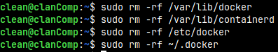 We can also remove all the remaining docker files. sudo rm -rf /var/lib/docker sudo rm -rf /var/lib/containerd sudo rm -rf /etc/docker sudo rm -rf ~/.docker