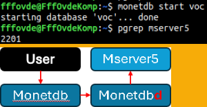 Because of that it is correct to say that Mserver5 process is not just a database, it is a WHOLE SERVER. Monetdbd is not really a server. That daemon is only a managing tool for Mserver5 processes. Almost the only thing databases within the same dbfarm folder share is their port number. So, "voc" and "newDB" are monetdb servers. "/home/fffovde/DBfarm1" and "/var/monetdb5/dbfarm" are just folders for those servers.