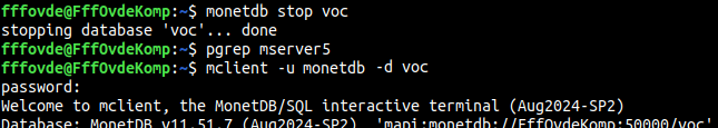 The other way is to just call database from mclient. I will first stop the database with "monetdb stop voc", and mserver5 will close.pgrep mserver5 #we can see that mserver5 is stoppedI'm closing the database just to show you that we can also open the database with the mclient. mclient -u monetdb -d voc | ![]() ![]() |
