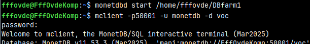 ![]() | Now, we are able to start manually our "DBfarm1":monetdbFor mclient application we have to provide our new port number: mclient -p50001 -u monetdb -d voc |