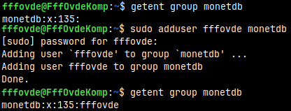 | If we want to use "systemd", it is wise to add your linux user to the "monetdb" user group, before creating a database. "Monetdb" user group was created when we installed MonetDB. getent group monetdb # we have group without users # we add user "fffovde" to "monetdb" groupgetent group monetdb # our user is now in the groupAfter that, you should log out/in, so that change becomes active. | ![]() |
