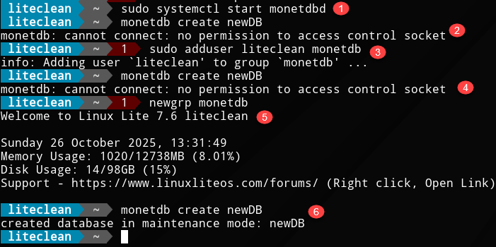 I must say that this is not always requirement. I didn't have to do this on "Zorin" linux distro. But on the "Linux Lite" distribution, and while using "systemd", it was a necessity. I could start " systemd" with "systemctl" (1), but I was not able to create a database (2). Solution was to add my user to "monetdb" group (3). After that I forgot to log out/in, so creation of the database was still impossible (4).Instead of logging in/out, we can just run the command " newgrp montedb" (5), and it is the same as if were logged out. Now creation of the database succeeded without problems (6). So, it is wise to always add your user to "monetdb" group. | ![]() |